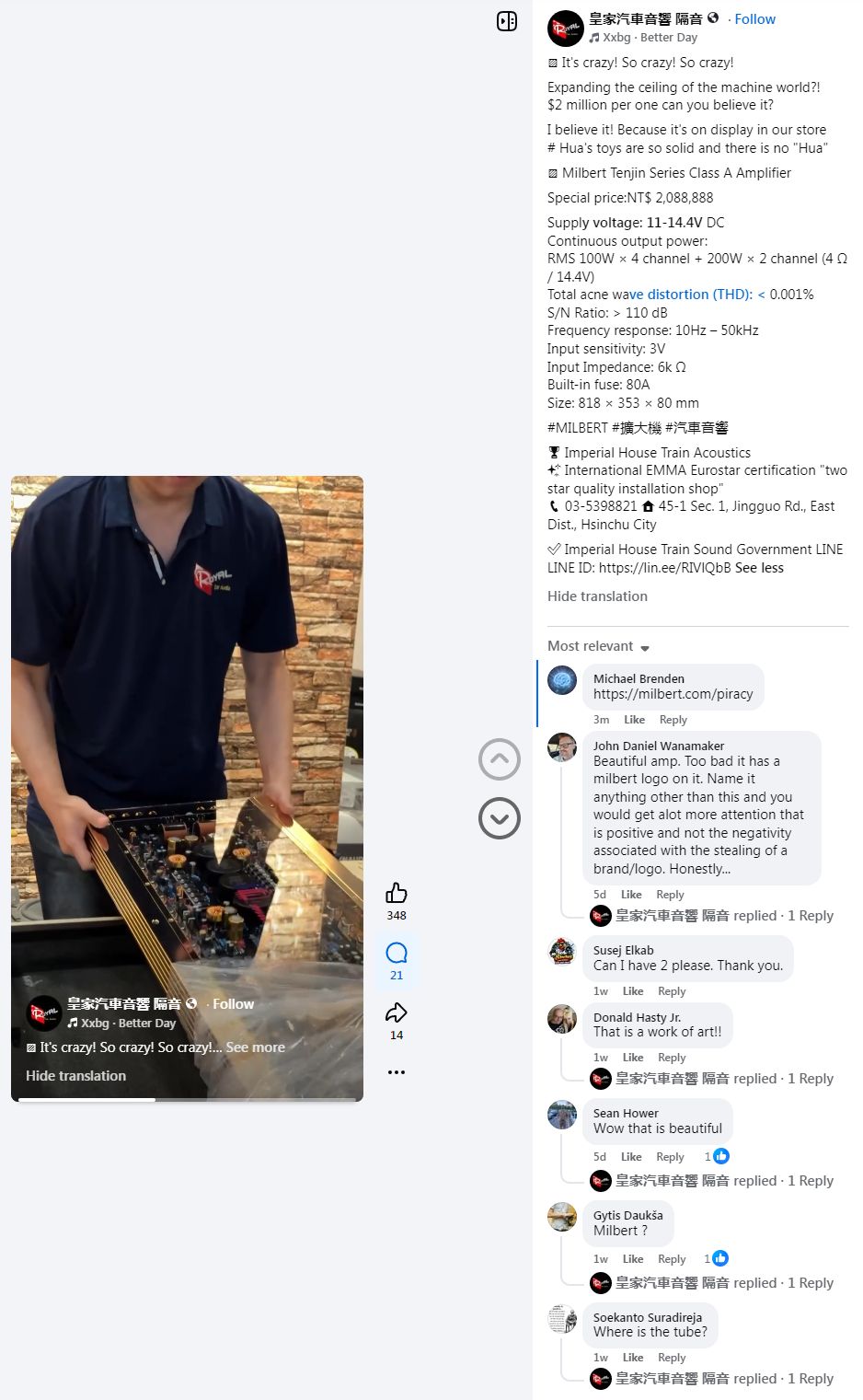 "Beautiful amp. Too bad it has a milbert logo on it. Name it anything other than this and you would get alot more attention that is positive and not the negativity associated with the stealing of a brand/logo. Honestly..." -- John Daniel Wanamaker, facebook