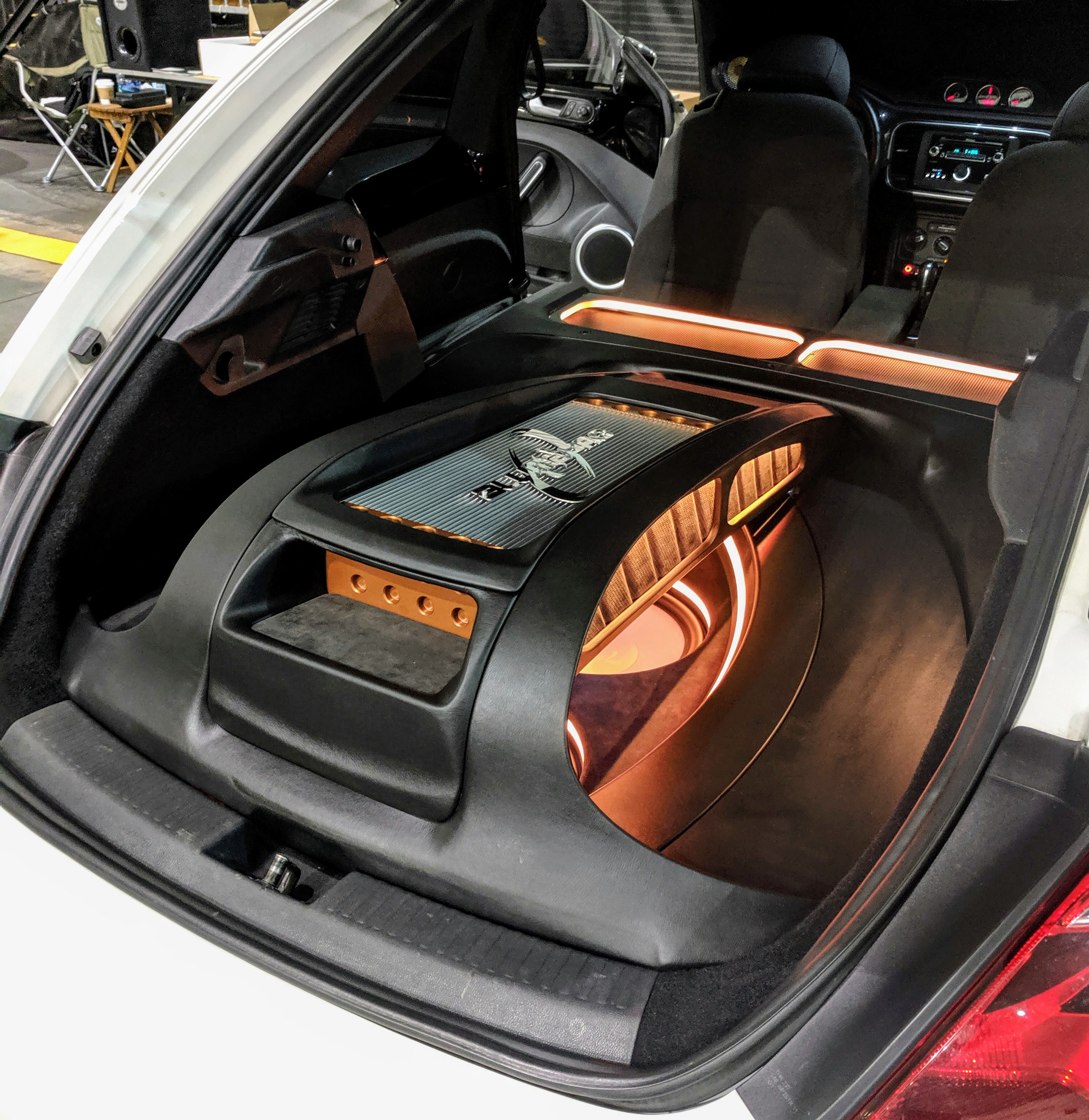 For the build, a custom birch spare tire well subwoofer enclosure was made to keep the lowest profile and weight to a minimum. Hybrid stuffing was used inside of the subwoofer enclosure to ensure the flattest and lowest response curve was achieved.